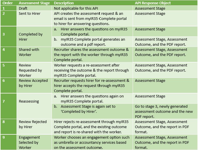 The connecting platform can read the assessment outcome (Inside IR35, Outside IR35 or Worker Determined) and the generated report at various stages of the assessment as highlighted in the table below.